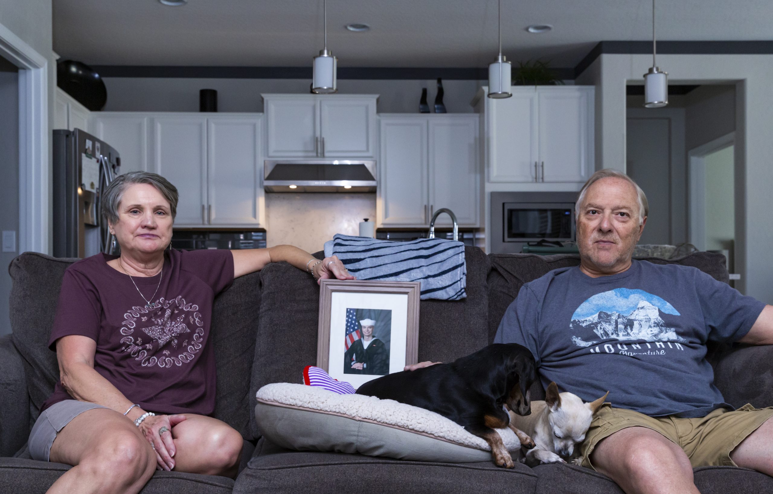 Jodee and Steve Watelet pose for a portrait in their home in Mesquite, Nev., on Friday, May 20, 2022. Their son took his own life in 2020. He was in the Navy. / Photo by Miranda Alam for Voice of San Diego