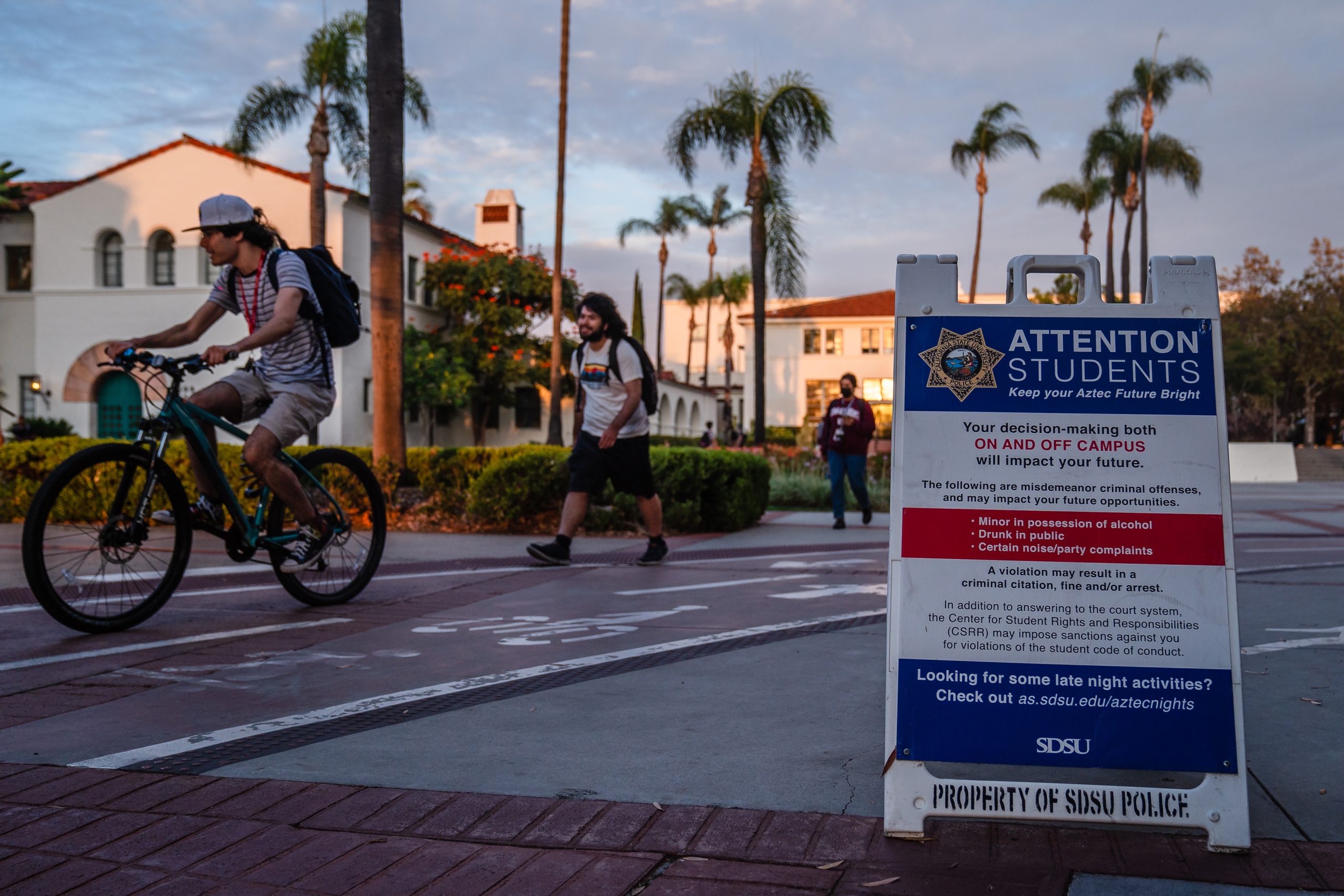 Students walk on campus near a sign from the San Diego State University police in the College Area on September 12, 2022. / Photo by Ariana Drehsler