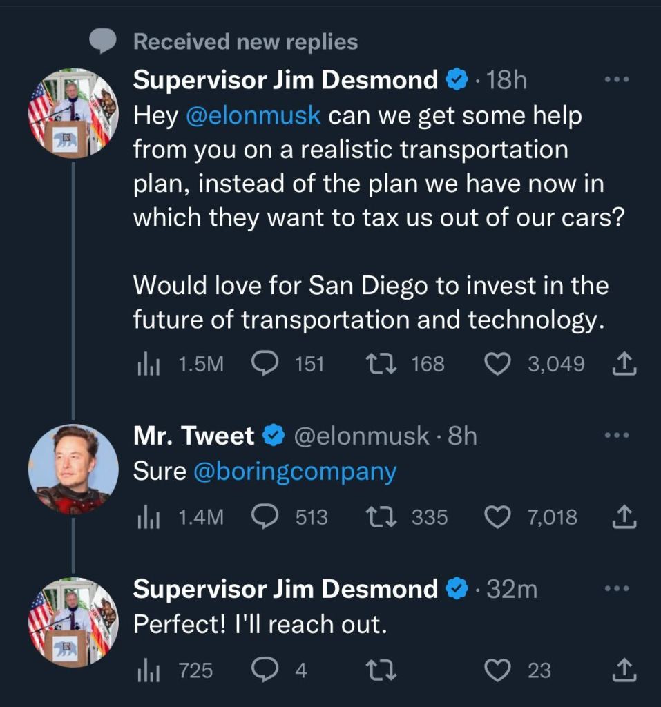 County Supervisor Jim Desmond tweeted at Elon Musk Friday asking for the billionaire’s input on San Diego’s transportation system. Musk said “sure” and then cc’d his Boring Company, which invented tunnels.