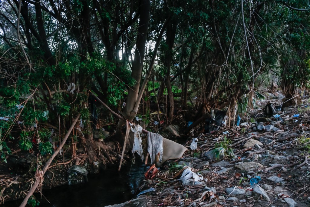 As we ventured into these areas, we found remnants of tents, clothes, blankets and other supplies scattered along what used to be encampments for groups of unhoused people. The items’ owners, though, were nowhere in sight.