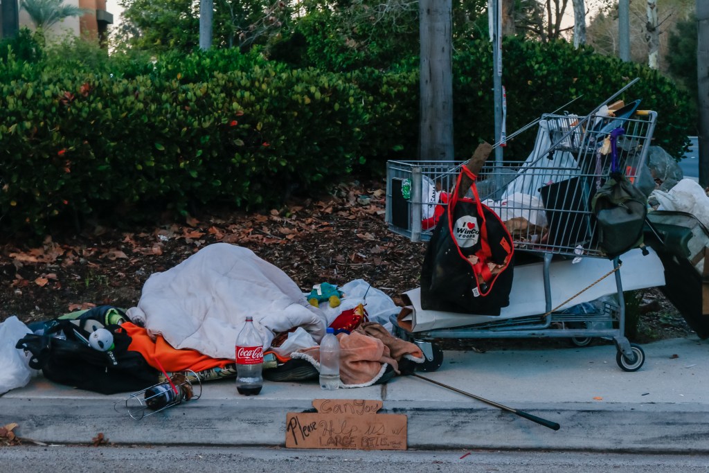 A homeless person sleeping alongside their belongings in Vista on Jan. 26, 2023 / Photo by Tigist Layne