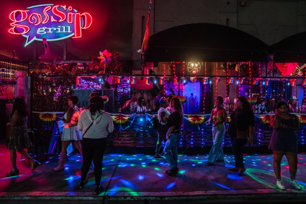 People outside of Gossip Grill in Hillcrest on July 12, 2025. / Ariana Drehsler for Voice of San Diego