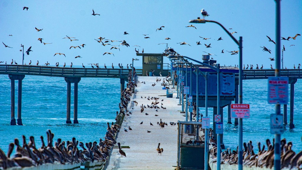 Pelicans took over the Ocean Beach Pier July 10, 2025. / Photo courtesy Jim Grant