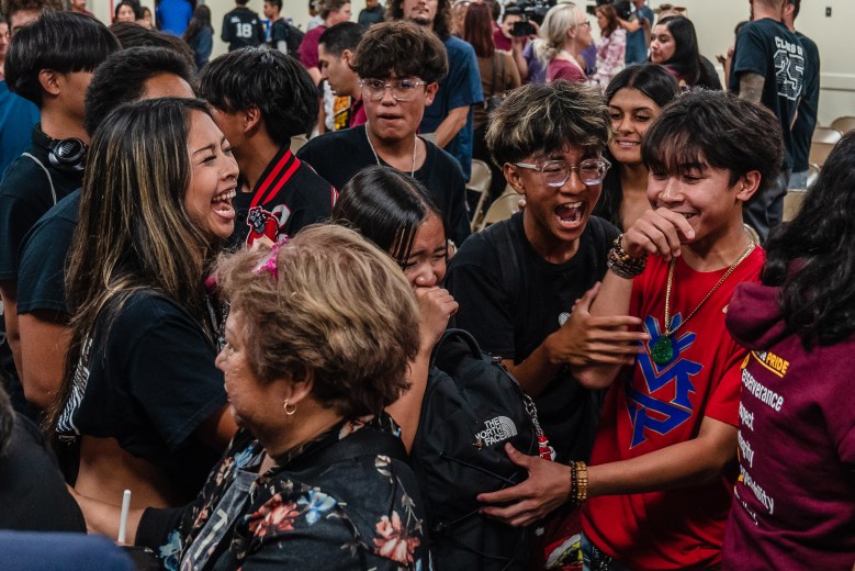 The announcement elicited thunderous cheers and applause from the about 200 community members gathered. Afterwards, a troupe of TV news cameras spoke to tearful, relieved attendees, many of whom came dressed in shirts bearing the school’s wildcat logo.
