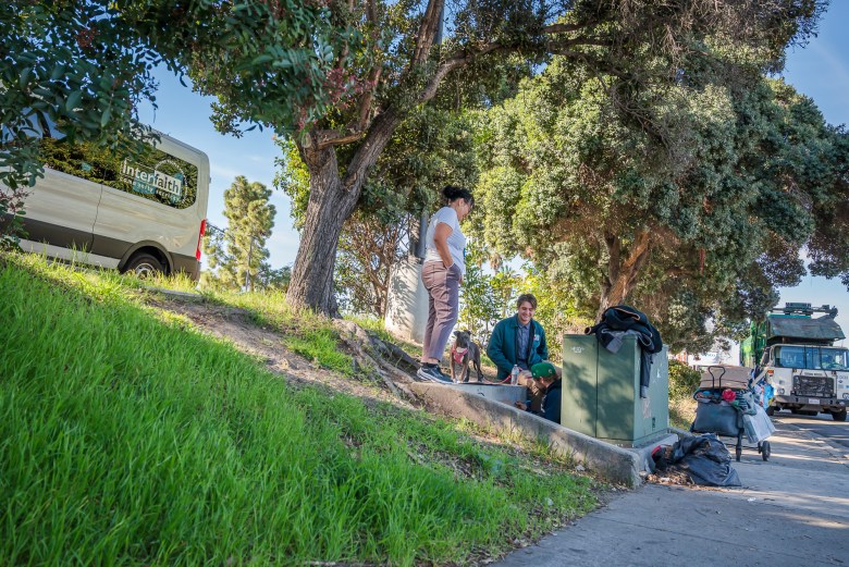 Veronica Basulto (L), outreach worker with Interfaith Community Services, and Isaiah Chavira (C), housing navigator with Interfaith Community Services, speak with Justin (R) about available resources in Oceanside on Tuesday, Jan. 20, 2026. /Vito Di Stefano for Voice of San Diego