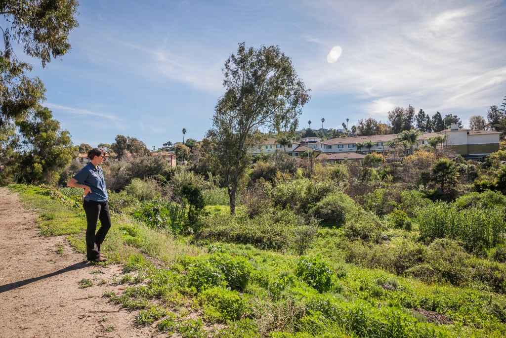 Sofia Hughes, management analyst for city of Oceanside, looks over the site of a former homeless encampment in Oceanside on Tuesday, Jan. 20, 2026. / Vito Di Stefano for Voice of San Diego